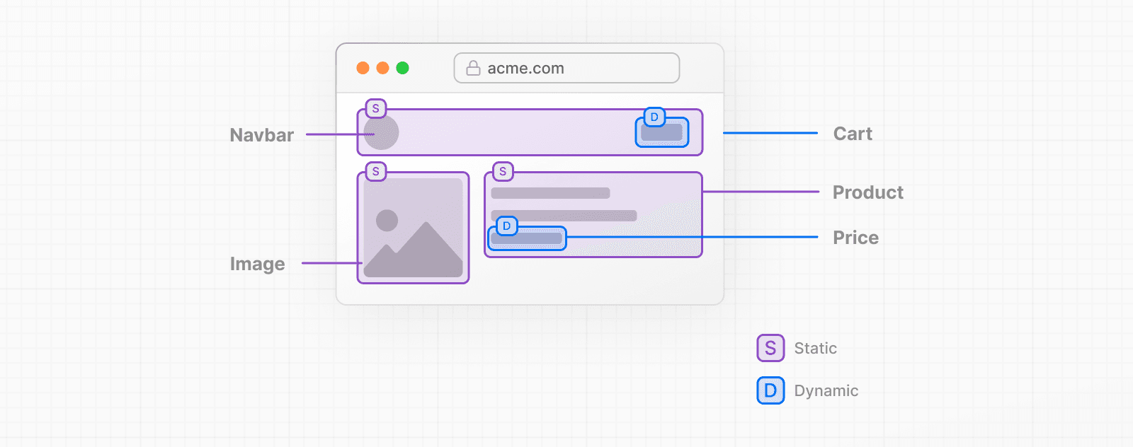 This wireframe of a typical product detail page shows elements that are typically static in purple and elements that are often dynamic in blue. With PPR the vast majority of content for such a page can get delivered instantly from the edge.
