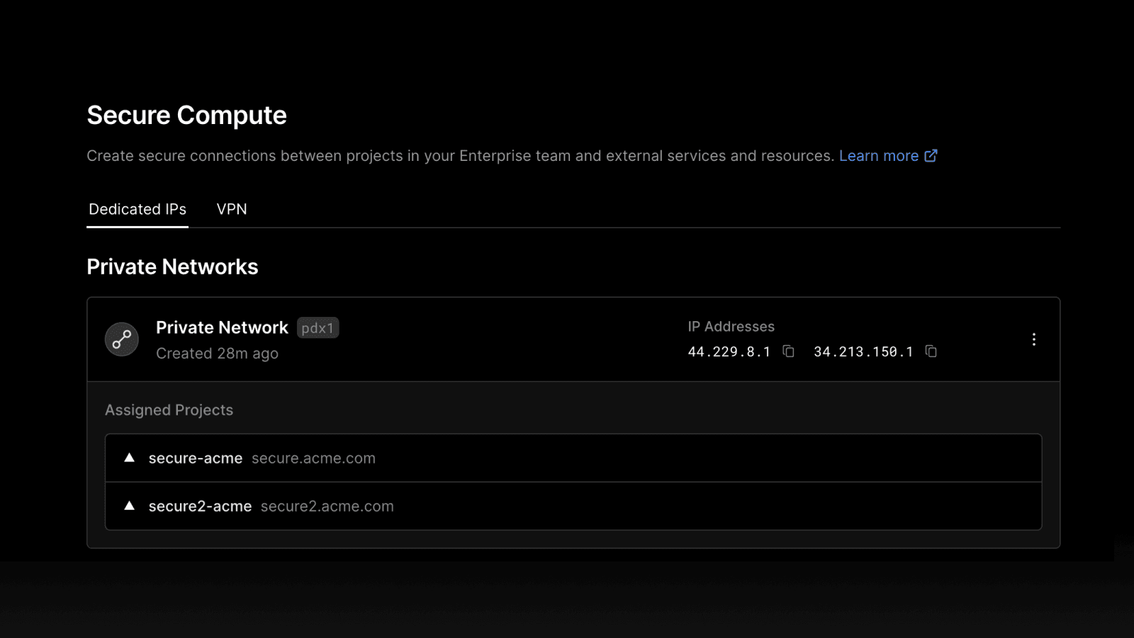 Secure Compute improves the security and compliance of your deployments on Vercel. For more information about Vercel Secure Compute on Enterprise, or if you require support for VPC peering or VPN connections, please contact our sales team.
